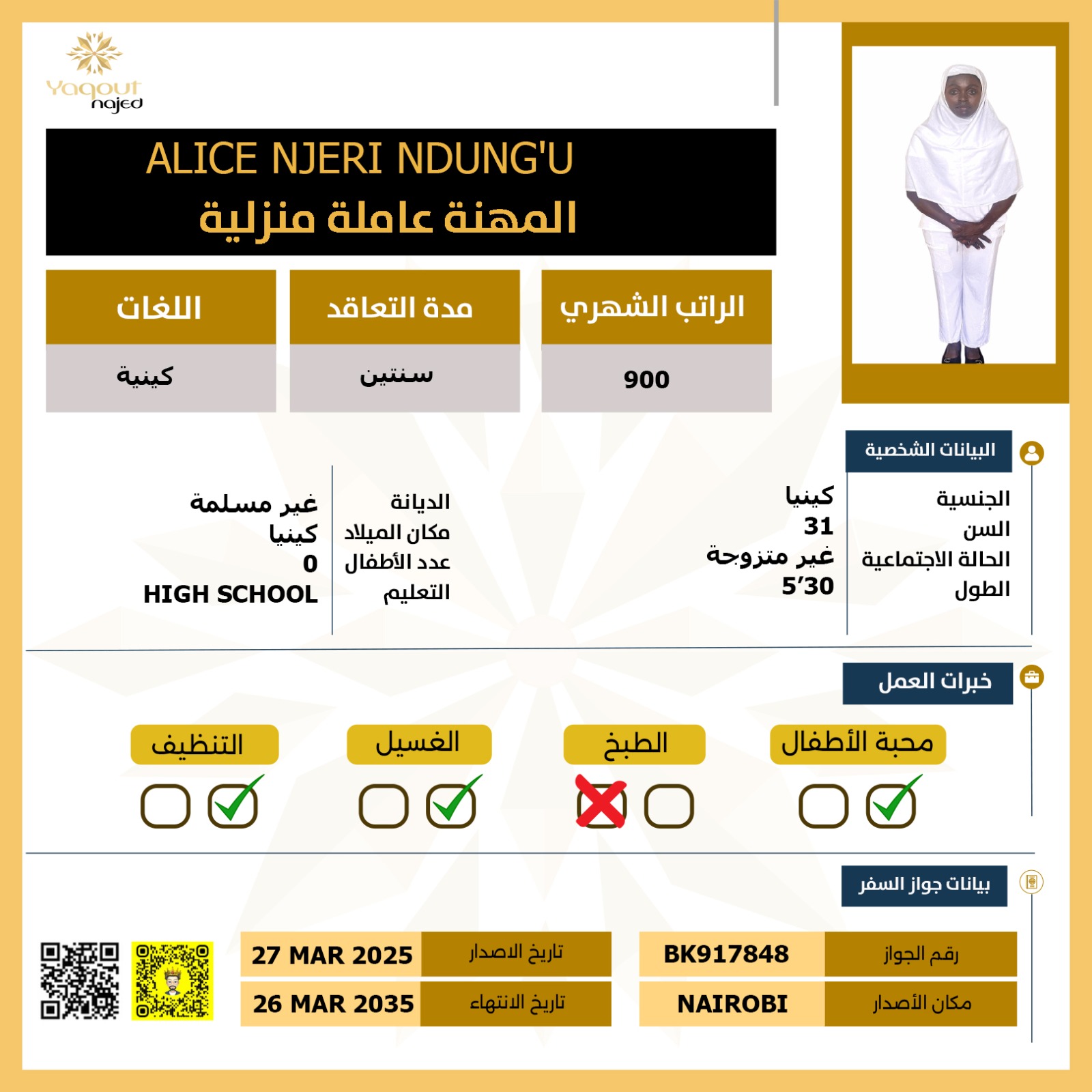 استقدام عاملة كينية تجيد اللغة الانجليزية وتمتاز بسرعة تأقلمها مع ظروف العمل والبيئة الجديدة الذكاء العالي الذي يمكنها من فهم مختلف الأعمار وكافة التلميحات.