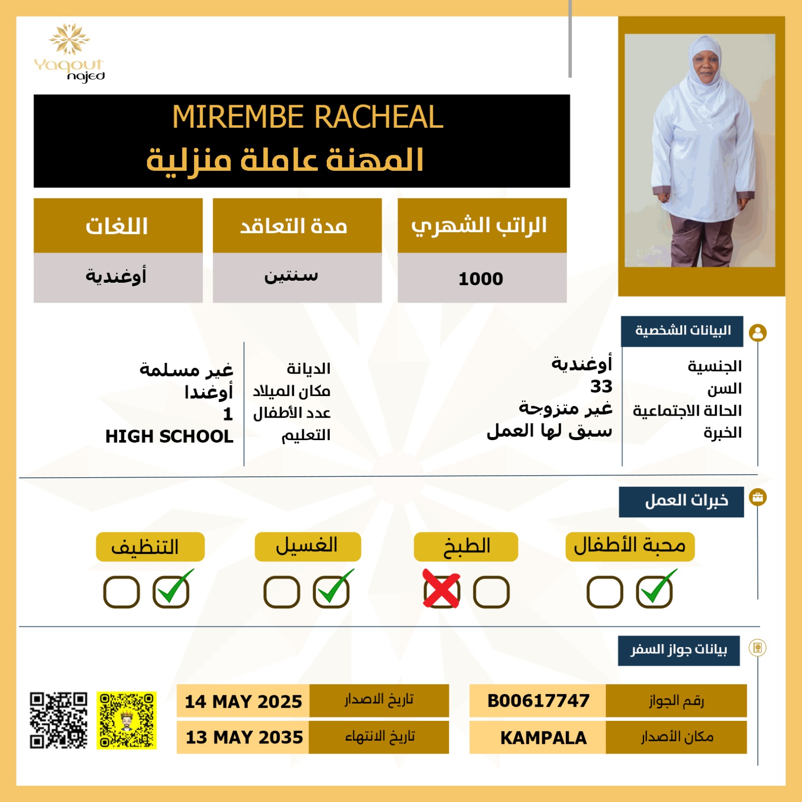 استقدام عاملة أوغندية تجيد اللغة الانجليزية وتمتاز بسرعة تأقلمها مع ظروف العمل والبيئة الجديدة الذكاء العالي الذي يمكنها من فهم مختلف الأعمار وكافة التلميحات.
